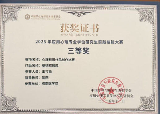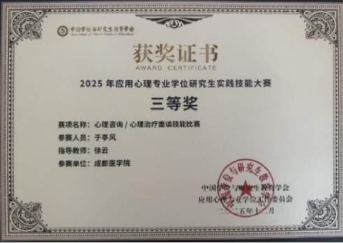 在“2025年全国应用心理专业学位研究生实践技能大赛”决赛中,经过层层选拔与激烈角逐,成都医学院参赛研究生凭借扎实的专业理论功底、娴熟的实践操作能力与严谨的专业素养,在众多参赛团队中脱颖而出,斩获心理科普作品创作比赛三等奖两项,充分展现了我院应用心理专业学位研究生过硬的专业水平与出色的实践创新能力。